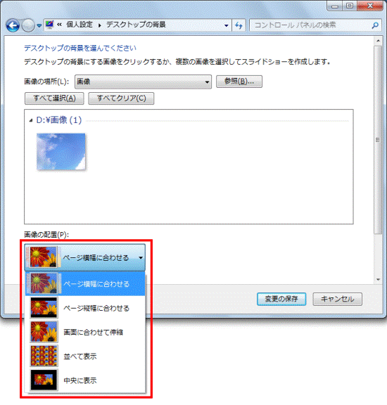 - 「画像の配置」の「▼」ボタンをクリックし、表示される一覧から、お好みの配置方法をクリックします。