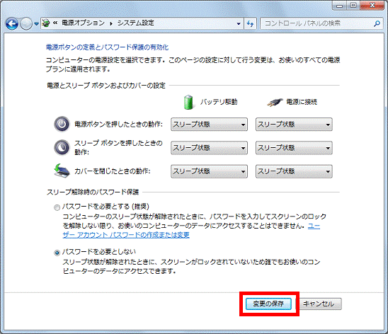 上の設定を変更してもパスワードの入力が必要なときは、「電源プランの設定を変更する」をご覧ください。