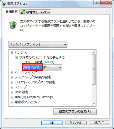 「スリープ解除時のパスワード保護」の設定を変更しても、パスワードの入力が必要なときは、次の手順で電源プランの設定を変更します。