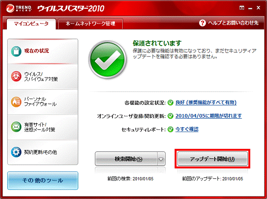 ウイルスバスター2010で、ウイルスやスパイウェアからパソコンを保護するには、ウイルスバスターに最新のプログラムやパターンファイルを適用する必要があります。