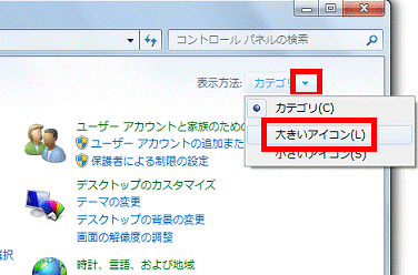 画面に右上にある「表示方法」の「▼」ボタンをクリックし、表示されるメニューから「大きいアイコン」をクリックします。