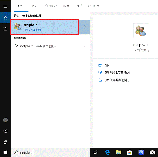 「最も一致する検索結果」にある、人のアイコンが表示されている「netplwiz」をクリックします。