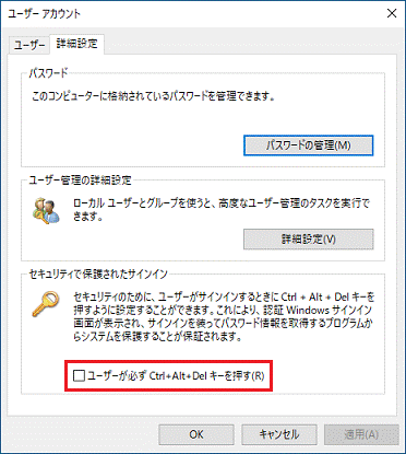 「ユーザーが必ずCtrl+Alt+Delキーを押す」のチェックを外します。