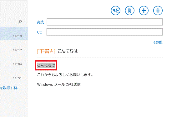 - メールの作成画面で、書式を設定したい文字をドラッグして選択します。