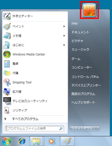 - スタートメニューの右上に表示されている、ユーザーアカウントの画像をクリックします。