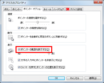 - 「表示」欄の「ポインターの軌跡を表示する」をクリックし、チェックを付けます。