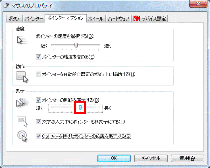 - 「ポインターの軌跡を表示する」の下にあるつまみをクリックしたまま左右に動かし、ポインターの軌跡の長さを調節します。