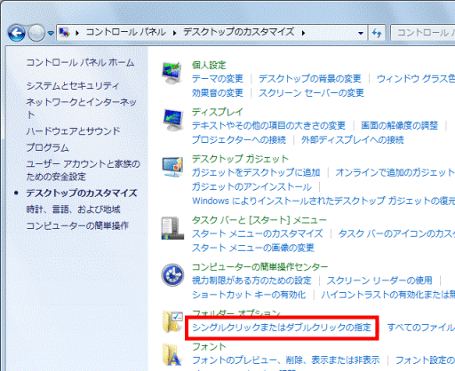 - 「フォルダーオプション」欄の「シングルクリックまたはダブルクリックの指定」をクリックします。