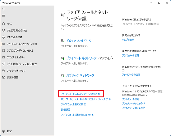 「Windows セキュリティ」の「ファイアウォールとネットワーク保護」から通信を許可、またはブロックに設定します。