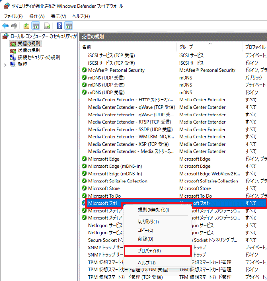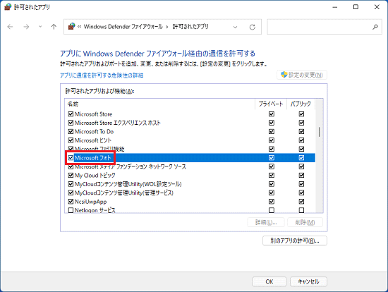 - ここでは、例としてMicrosoft フォトの通信を許可する設定にします。