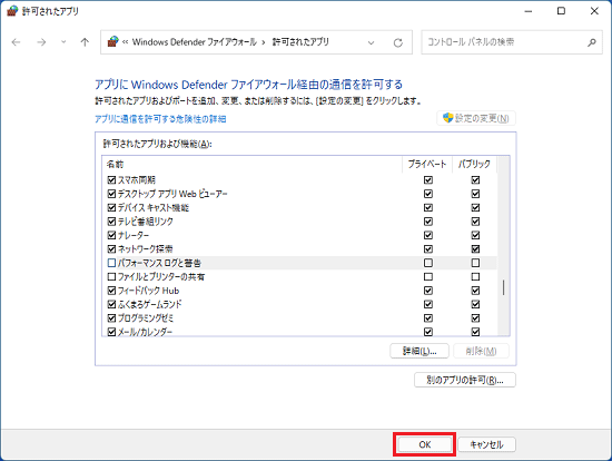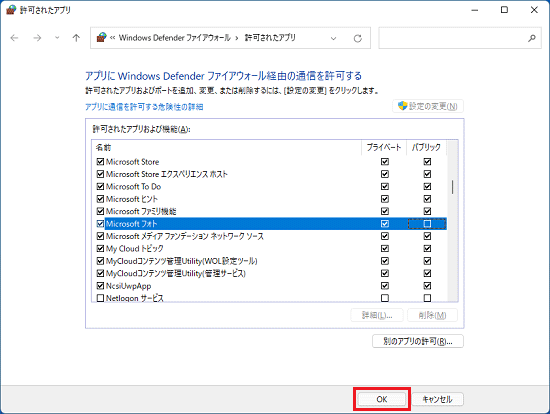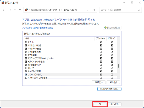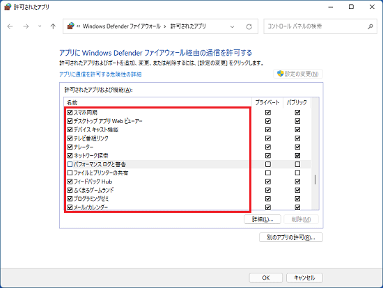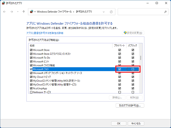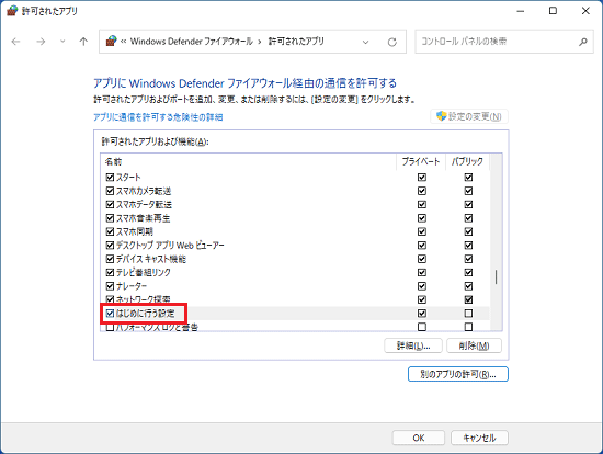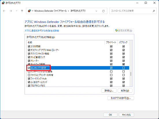 アドバイス - 「プライベート」または「パブリック」をクリックし、通信を許可するネットワークにチェックを付けます。