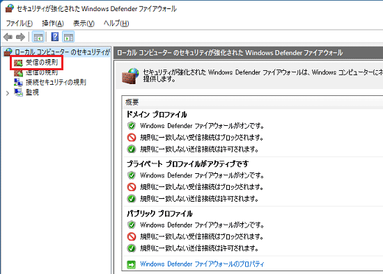 「はい」ボタンをクリックします。 - 画面の中央に「ローカル コンピューター のセキュリティが強化された Windows Defender ファイアウォール」と表示されます。