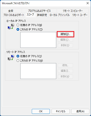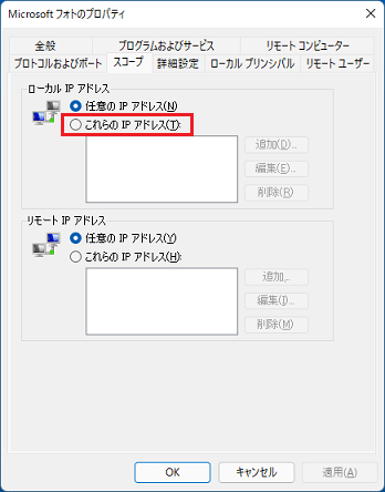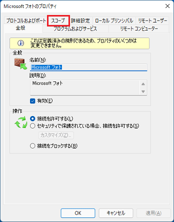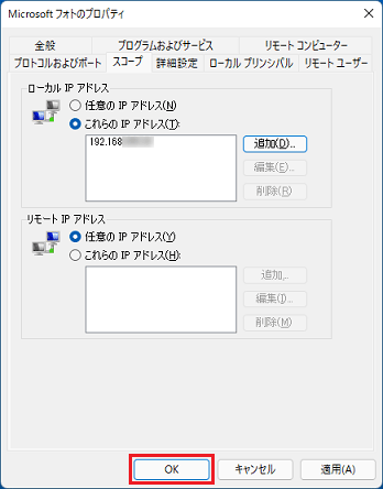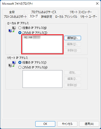 アプリの通信を許可するネットワークを、家庭内LANや、特定のパソコンに限定したい場合は、次の手順で、スコープを変更します。