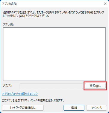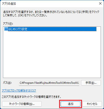 アプリの通信を許可するネットワークの範囲は、初期の設定では、インターネットを含め、ネットワークに接続されているパソコンすべてが対象に設定されています。