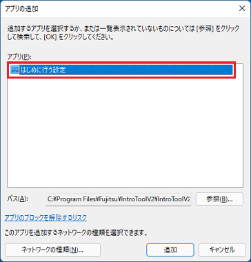 「許可されたアプリ」の一覧にアプリがない場合は、アプリを追加してから、通信を許可する、またはブロックするかを設定します。