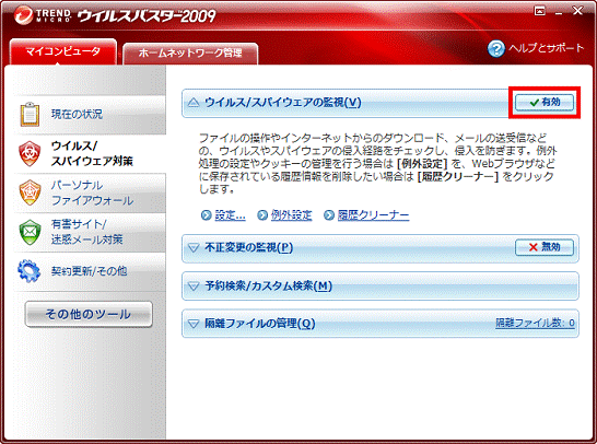 - 「ウイルス/スパイウェアの監視」の右にあるボタンが「有効」になっていることを確認します。
