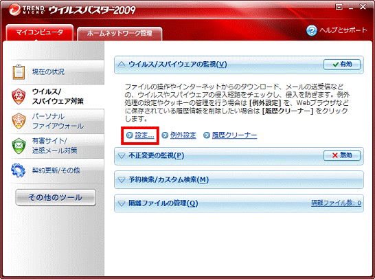 「設定」が表示されていない場合は、「ウイルス/スパイウェアの監視」をクリックします。 - 「ウイルス/スパイウェアの監視」が表示されます。