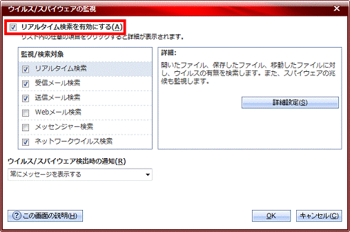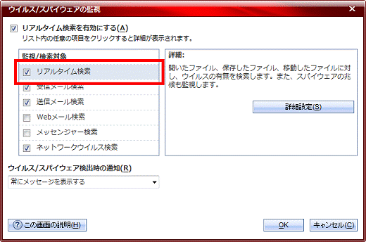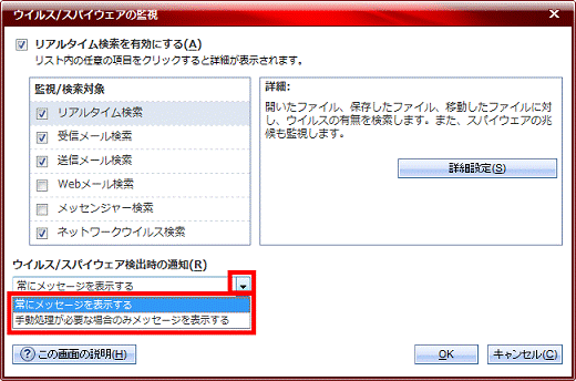 表示される詳細設定画面で、お好みの項目を設定し、「OK」ボタンをクリックします。 - 「ウイルス/スパイウェア検出時の通知」の下にある「▼」ボタンをクリックし、表示される一覧からお好みの通知方法をクリックします。