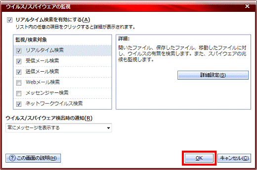- 「OK」ボタンをクリックし、「ウイルス/スパイウェアの監視」を閉じます。