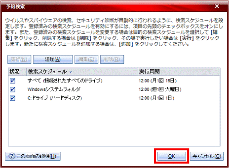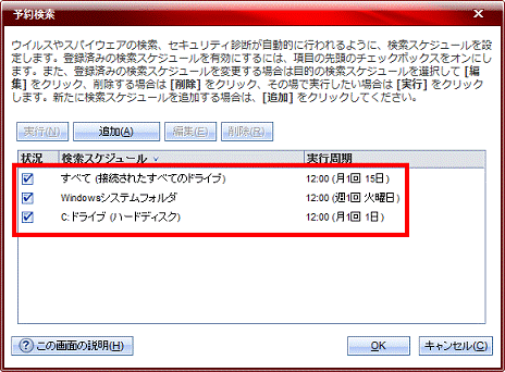 ウイルスやスパイウェアを自動でチェックするときは、あらかじめ「予約検索」機能にチェックする間隔や検索場所を設定しておきます。
