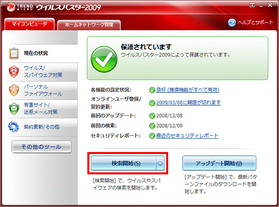 検索が終了するまで、しばらく待ちます。 - 検索が終了し、ウイルスバスター2009のメイン画面に戻ったことを確認します。