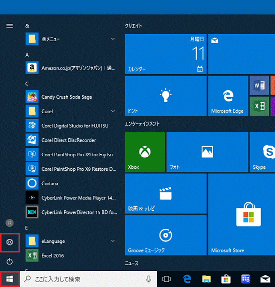 - 「スタート」ボタン→「設定」の順にクリックします。