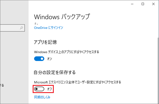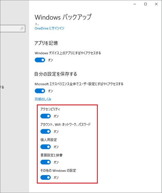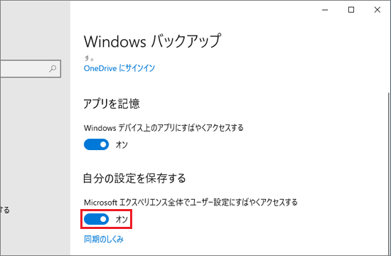 「Windows バックアップ」がオンになっている場合、Microsoft アカウントでサインインしたすべてのWindows 10の機種で、選択した設定が同期されます。