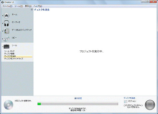 - 「プロジェクトを実行中」と表示され、ディスクの消去が開始されます。