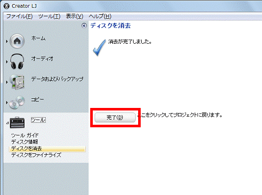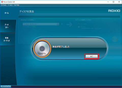 ディスクを取り出し、「完了」ボタンをクリックします。