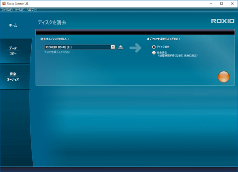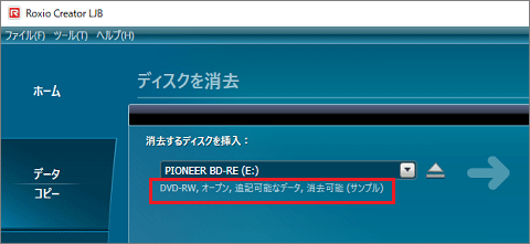 消去する前に、必要なデータが保存されていないかどうか、必ずディスクの中身を確認してください。 - Roxio Creator LJ / LJB で使用できる書き換え可能なディスクは、CD-RW、DVD-RW、DVD+RW、BD-RE、BD-RE DL、BD-RE XL です。