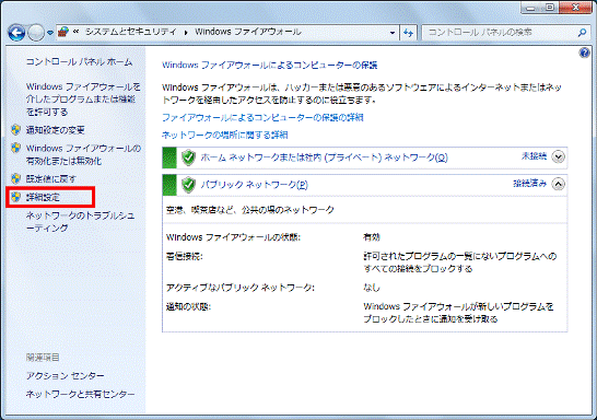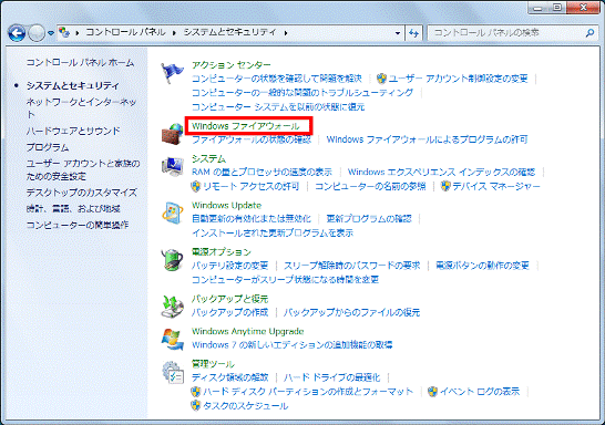 「システムとセキュリティ」が表示されていない場合は、「Windows ファイアウォール」をクリックし、手順4.に進みます。 - 「システムとセキュリティ」が表示されます。