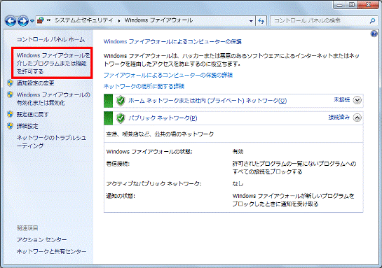 「Windows ファイアウォールを介したプログラムまたは機能を許可する」をクリックします。