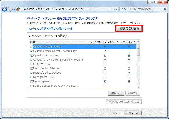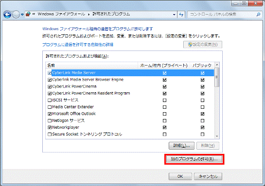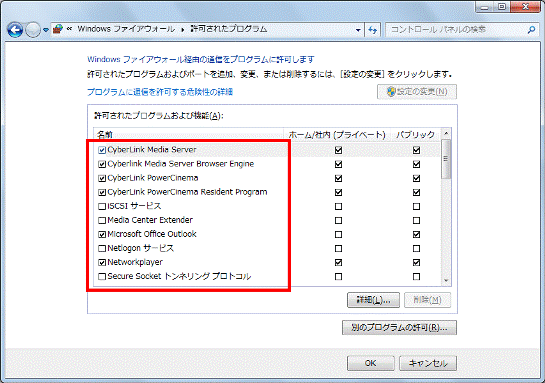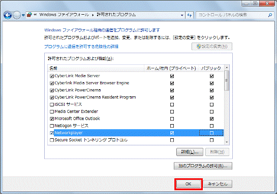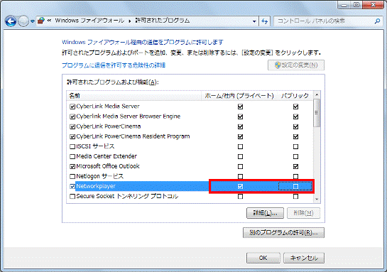 プログラムの通信をブロックする場合は、「NetworkPlayer」をクリックしチェックを外します。 - 「ホーム/社内(プライベート)」と「パブリックを」クリックし、通信を許可するネットワークにチェックを付けます。