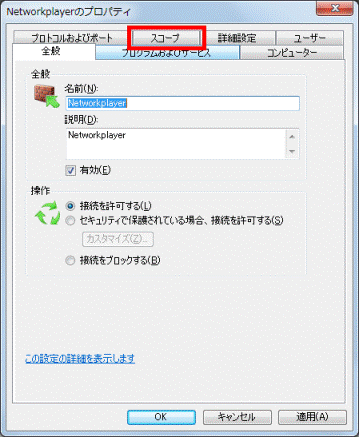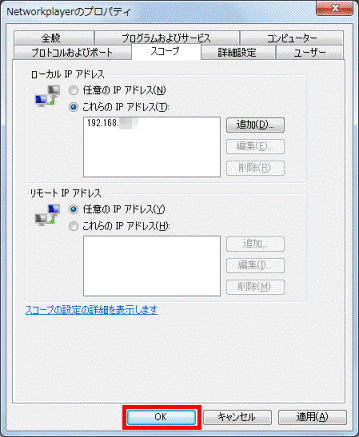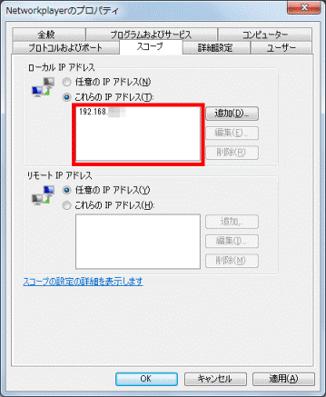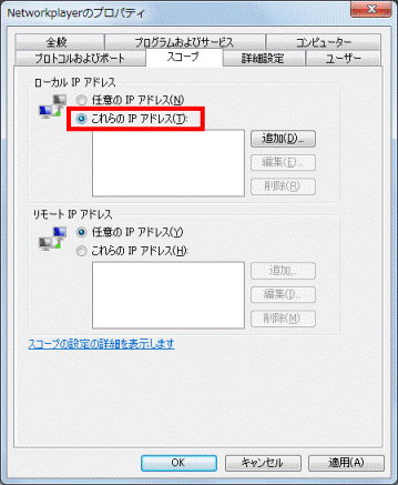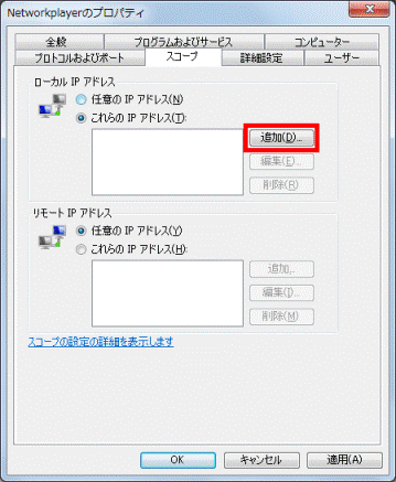 プログラムの通信を許可するネットワークを、家庭内LANや、特定のパソコンに限定したい場合は、次の手順で、スコープを変更します。