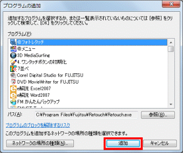 「プログラム」の一覧に、目的のプログラムが表示されていない場合は、「参照」ボタンをクリックし、プログラムを指定します。 - 「追加」ボタンをクリックします。