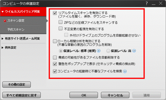 「ウイルス/スパイウェア対策」にある各項目の詳細と、ウイルスバスタークラウドをインストールした直後の状態は、次のとおりです。- リアルタイムスキャンを有効にする(ファイルを開く、保存、ダウンロード時):有効