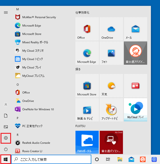 - 「スタート」ボタン→「設定」の順にクリックします。