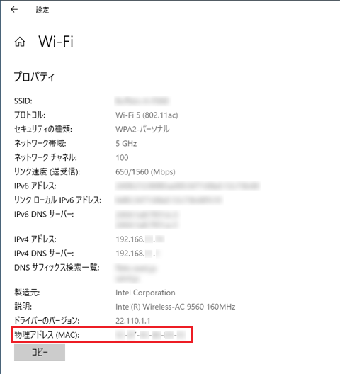- 「物理アドレス(MAC)」の右に表示されるMACアドレスを確認します。