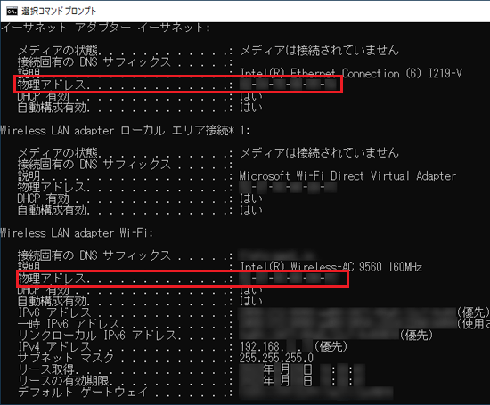 - 「物理アドレス」の右に表示されるMACアドレスを確認します。