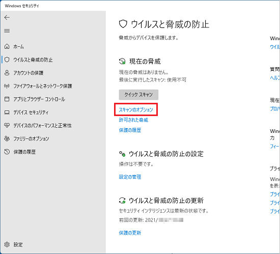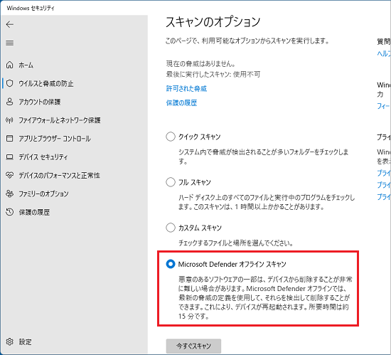Windows セキュリティの「スキャンのオプション」からオフラインスキャンを実行します。