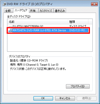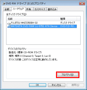 - 「OK」ボタンをクリックし、CD/DVDドライブのプロパティを閉じます。