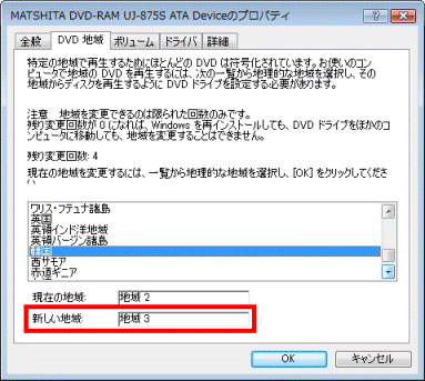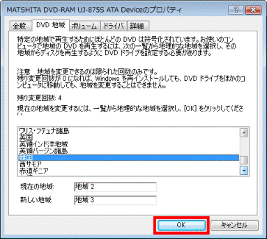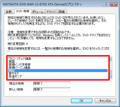 リージョンコードを変更できる回数を確認するだけの場合は、「×」ボタンをクリックし、プロパティと「コンピュータ」を閉じて操作を終了します。 - 地域の一覧から、変更したい地域をクリックします。