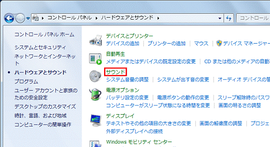 「ハードウェアとサウンド」が表示されていない場合は、次の手順へ進みます。 - 「サウンド」をクリックします。