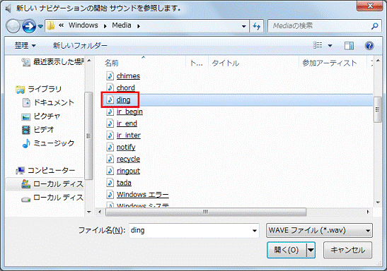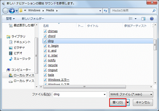 必要に応じて、サウンドファイルを保存している場所に移動してください。 - 設定したいサウンドファイルが選べたら、「開く」ボタンをクリックします。