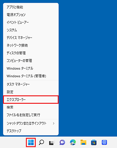 タスクバーに「エクスプローラー」アイコンが表示されていない場合は、スタートボタンを右クリックし、表示されるメニューから「エクスプローラー」をクリックします。