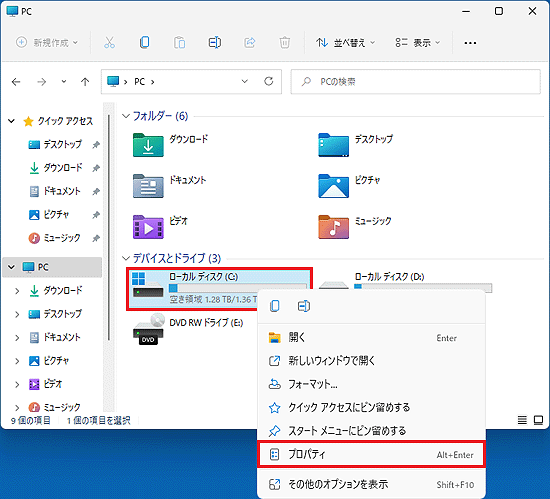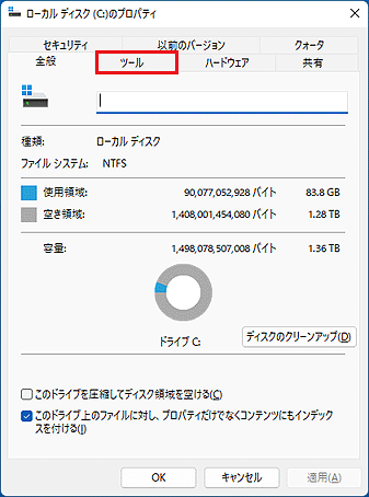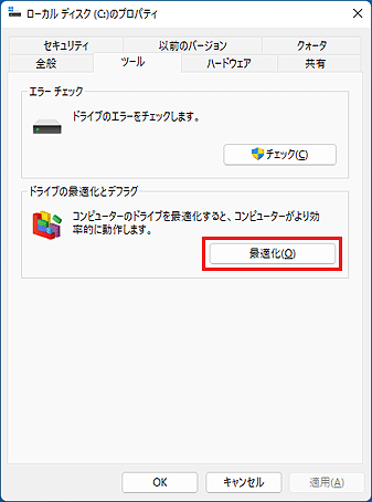 ディスクデフラグは、ローカルディスクのプロパティにある「ドライブの最適化」から行います。
