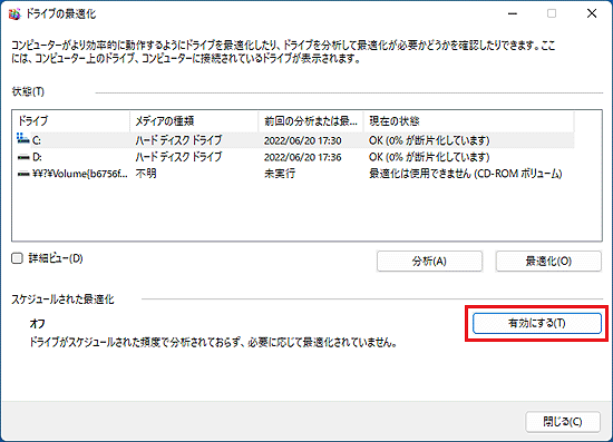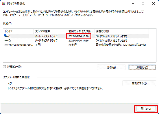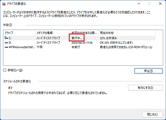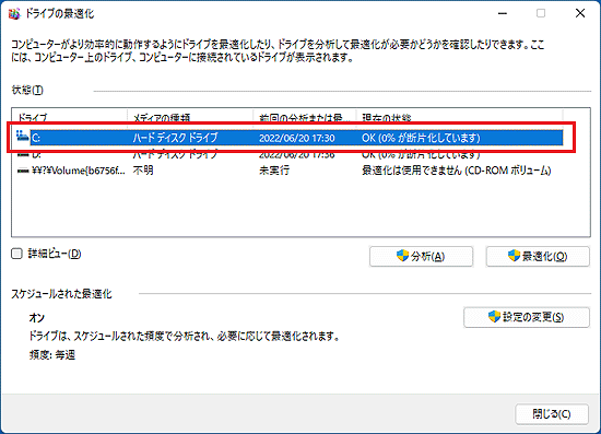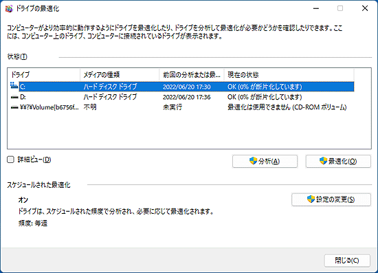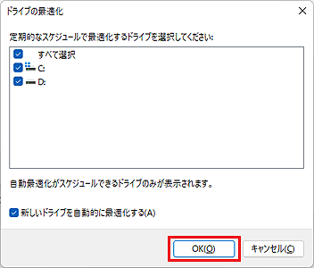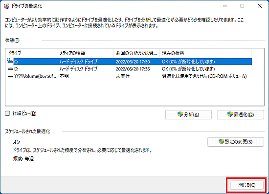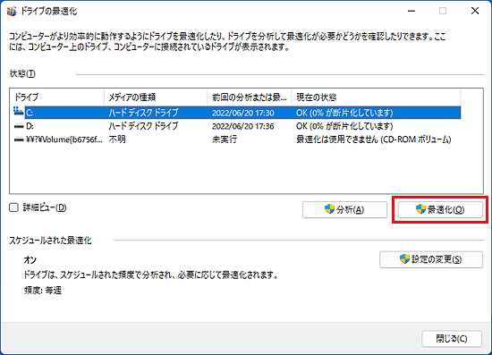次の操作で、「ドライブの最適化」を開きます。