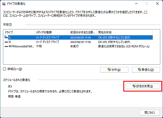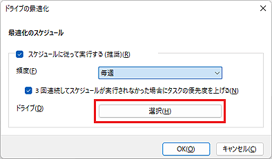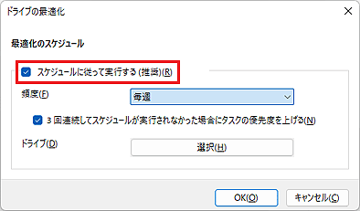 ディスクデフラグのスケジュールを設定することで、設定した周期で定期的に実行されるようになります。