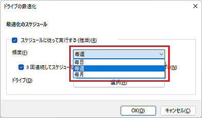」ボタンをクリックし、表示されるメニューから、ディスクデフラグを実行する頻度をクリックします。
