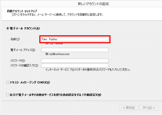 「名前」欄に入力した名前は、メールを送信した相手に、差出人の名前として表示されます。 - 「電子メールアドレス」欄に、メールアドレスを入力します。